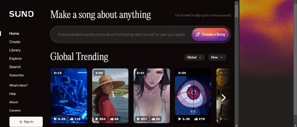 Suno AI là một trình tạo nhạc phổ biến mà trẻ em có thể sử dụng để sản xuất bài hát miễn phí. Nền tảng này có thể tạo ra mọi thứ, từ lời bài hát đến giọng hát và nhạc cụ, từ một lệnh văn bản đơn giản. Bất kỳ bài hát nào được tạo ra bởi người dùng đều có thể tải xuống, dưới dạng âm thanh hoặc video. Mặc dù Suno đã có cơ chế để ngăn việc tạo ra âm nhạc có nội dung khiêu dâm hoặc phản cảm, phụ huynh vẫn nên giám sát nội dung vì có thể vẫn xuất hiện những nội dung không phù hợp với trẻ em.